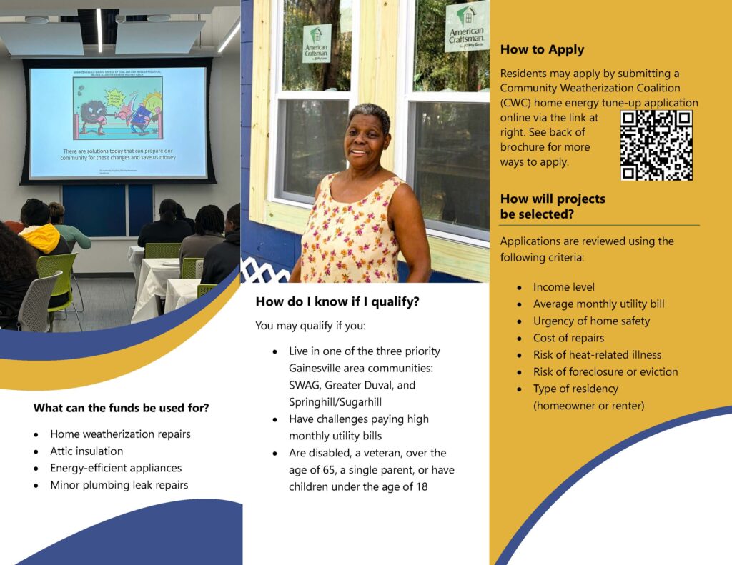 Since May of 2022 the EMPOWER Coalition has worked together to support neighbors in three collaborating priority neighborhoods in Alachua County whose residents have high energy burdens (Springhill and Sugarhill, Greater Duval, and SWAG). EMPOWER focuses on lowering energy bills, providing opportunities for access to solar benefits, and enhancing resilience.